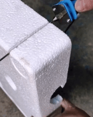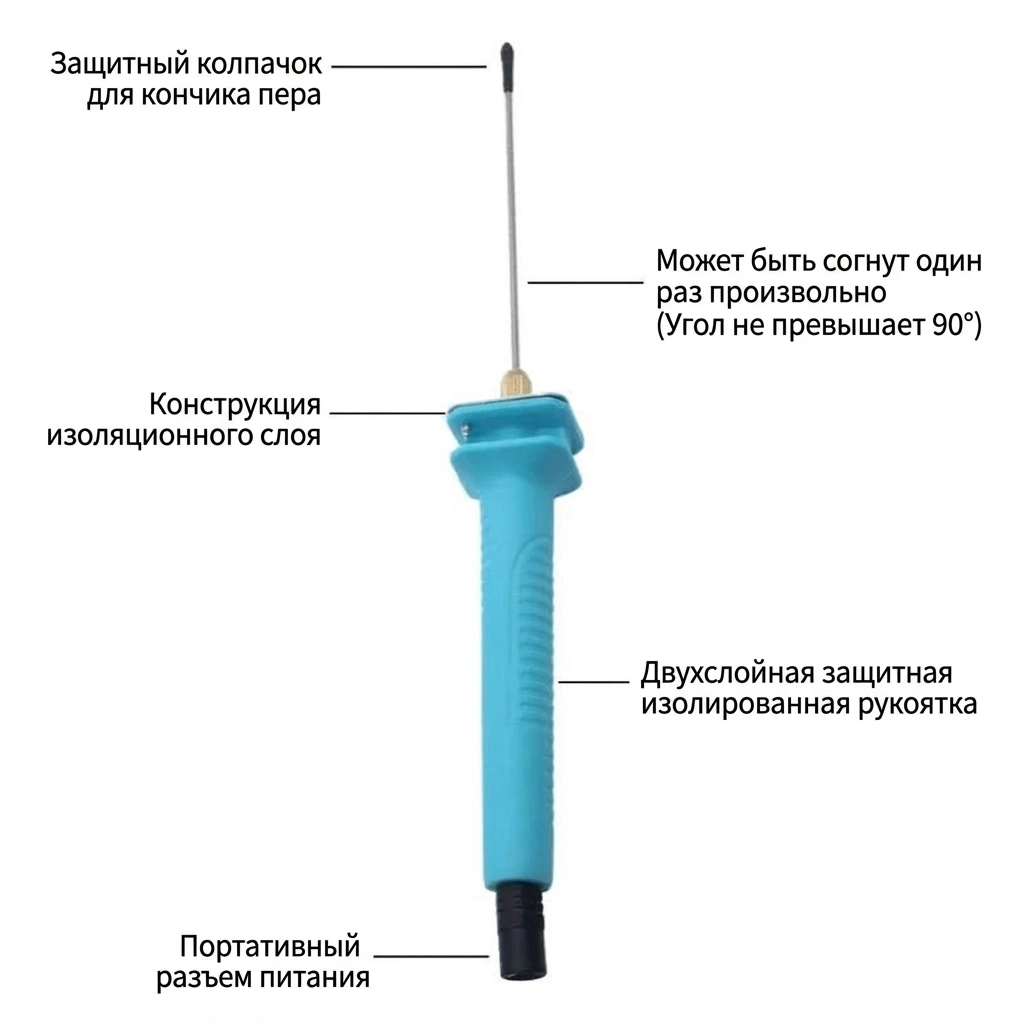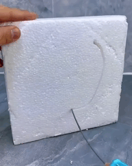 Element grzewczy topi styropian wzdłuż linii cięcia — krawędź jest gładka, bez odprysków i zanieczyszczeń. Podłączany do sieci 220V za pośrednictwem zasilacza z przełącznikiem.
